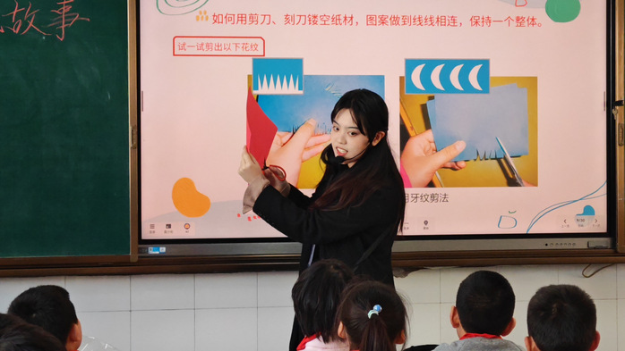 实习期间,同学们深入小学教学一线,在指导员工的悉心指导下,全面参与音乐、美术等学科的教学工作。同学们依据小学音乐、美术课程标准,精心设计了《山谷回声真好听》《理发师》《盘泥条》《剪纸故事》等一系列丰富多彩的课程。在一年级至六年级的课堂上,实习生们通过情境导入、游戏互动、示范演示等多样化的教学手段,充分调动了员工的积极性,展现了扎实的教学基本功和良好的课堂驾驭能力。